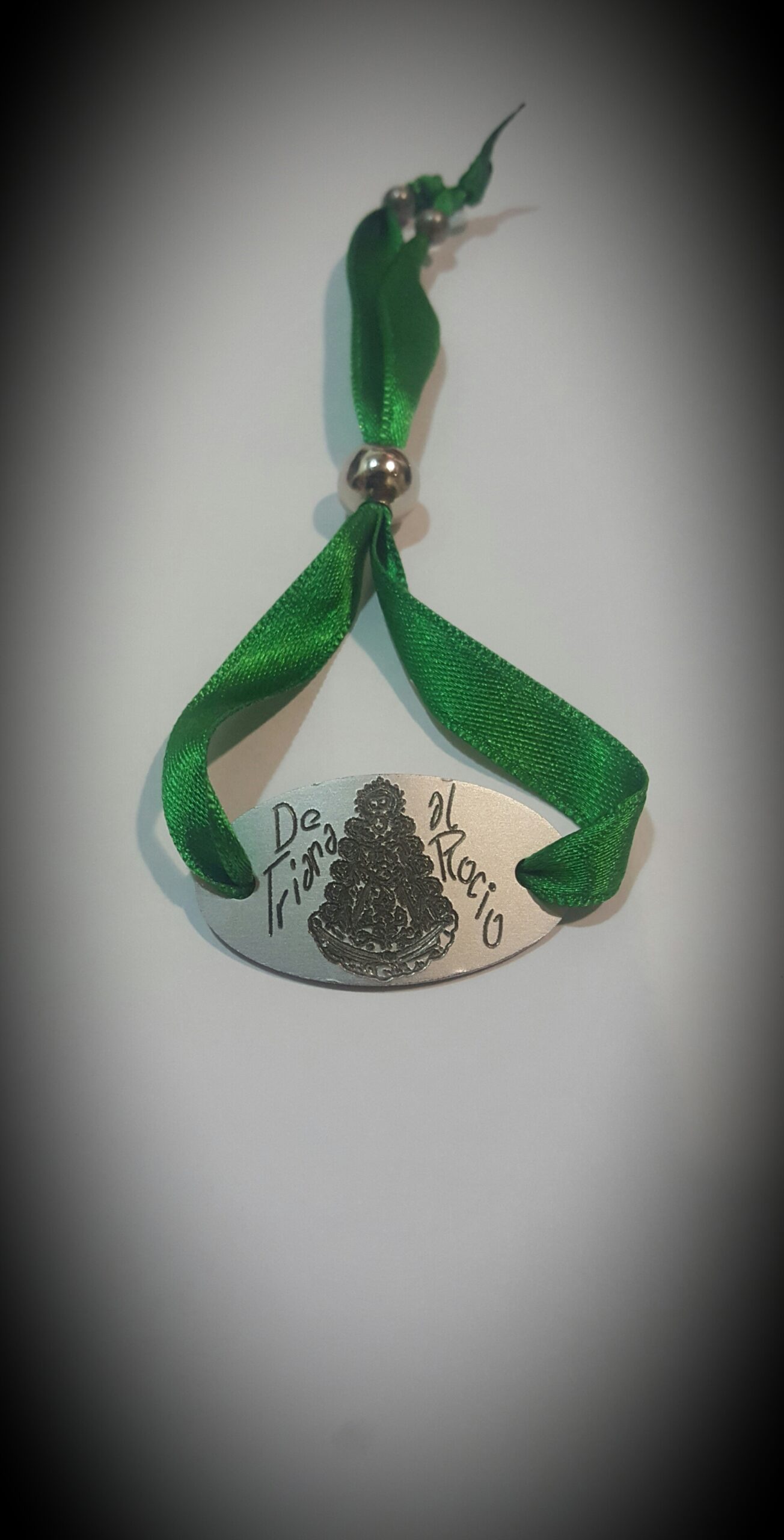 Dinos desde donde sales al Rocío o pon la frase que quieras.Pulsera en placa de aluminio de 3.70 x 2 cm,